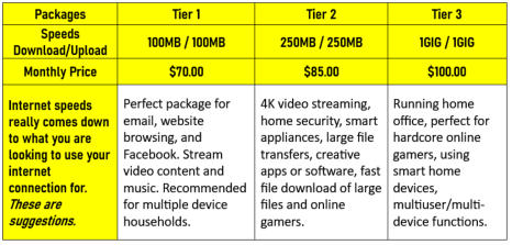 packages are listed with the basic fiber internet package starting at $70.00/month.